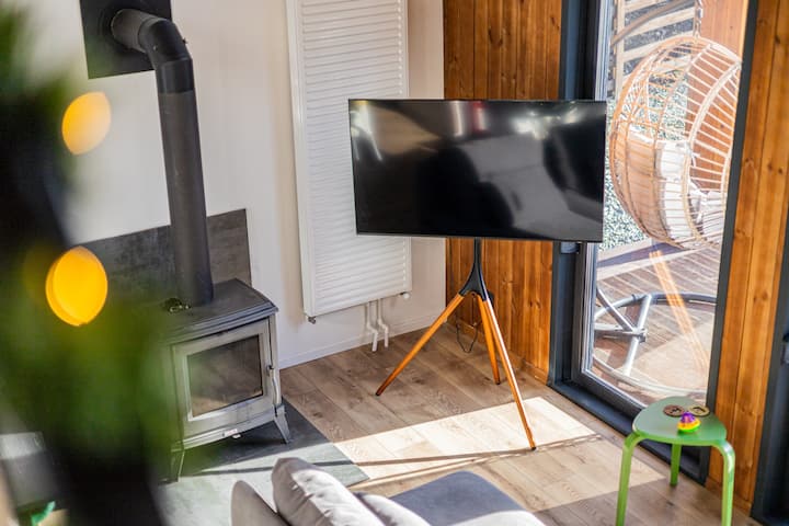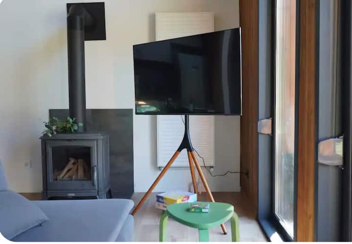 The green stool awkwardly contrasts with the sleek setup.